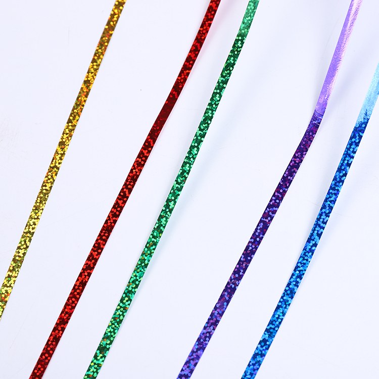 This holographic curling balloon ribbon is made from durable plastic material with a smooth surface that curls easily when pulled with scissors or a curling tool. The holographic coating reflects multiple colors under light, making decorations look lively and modern.