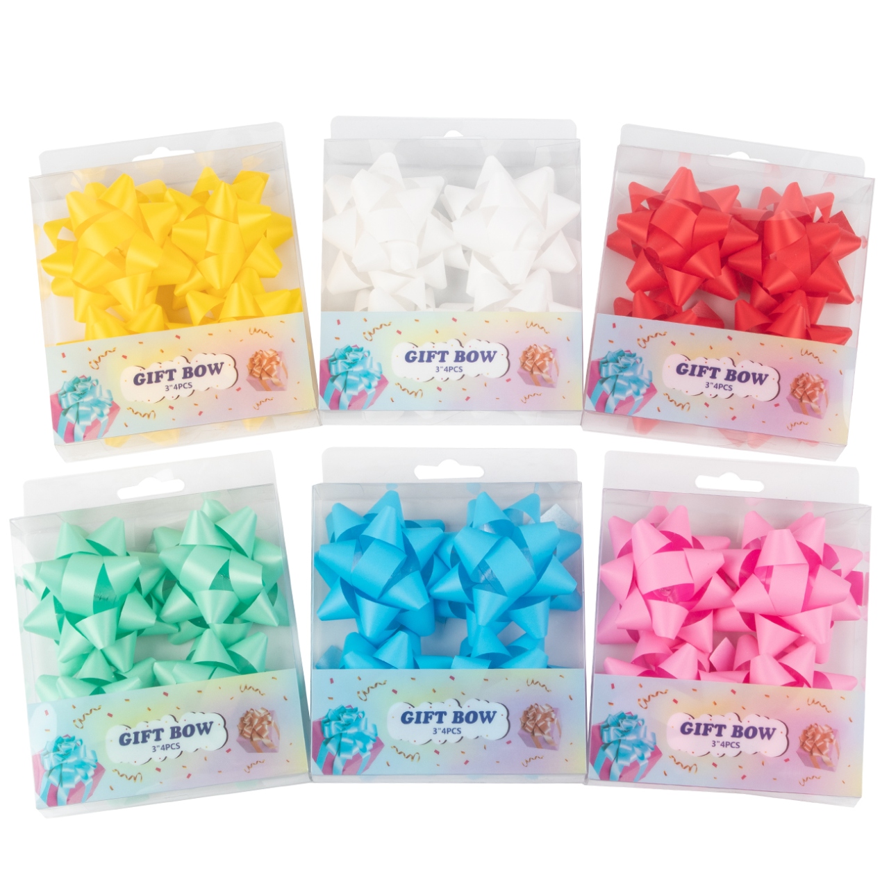 Packed in a clear PET box with 4 pieces per set, these bows are perfect for retail display, gift shops, and promotional packaging. Their vibrant solid colors and elegant matte texture make them suitable for all occasions.